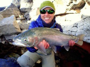 Spring started off as usual with low clear flows that required primarily nymphing and streamer fishing. In the spring, the best fishing tends to be on the best weather days. Nice warm sunny days tend to wake the fish up and get them in a feeding mood. This doesn’t mean you can’t have good fishing on cloudy day, it’s just more pleasant for the fisherman to be in sunny warm weather than cloudy cool weather. The one plus of cloudy spring days is that you can have excellent streamer fishing at times with extra-large fish looking to eat your streamer. When fishing with us this time of year expect to be fishing primarily sub-surface. Streamer patterns and nymphs are the name of the game. The best nymphs vary but, I like to fish midges in primarily red and black, stonefly patterns in large sizes, scuds (where they’re present), prince nymphs, rainbow warriors, black and red copper john’s, and egg patterns where rainbow trout are present. For streamers I like to fish slightly smaller patterns, 2-3 inch, in white, brown, black, and extra flashy. I like streamers with lots of weight that get down quickly and get into the strike zone, true “chuck and duck” fly fishing. There’s been a recent trend in fly fishing to throw HUGE streamers, 5-8 inches, with multiple large hooks. I don’t like this for a few reasons. One is that the large hooks, especially if they’re barbed, kill and damage a lot of fish and when doing this you limit yourself to only some of the largest fish in the river and exclude all the other good sized fish you should be catching. I assure you, big fish eat far more 2-3 inch baitfish than they do 7-8 inch baitfish. An example of this is the large lake trout that is pictures with this post. This is a 15 lb fish and it ate a 4 inch long pattern, not an 8 inch long pattern. The person who is fishing a 3 inch long streamer will catch exponentially more fish than someone who is throwing an 8 inch long, triple articulated streamer.